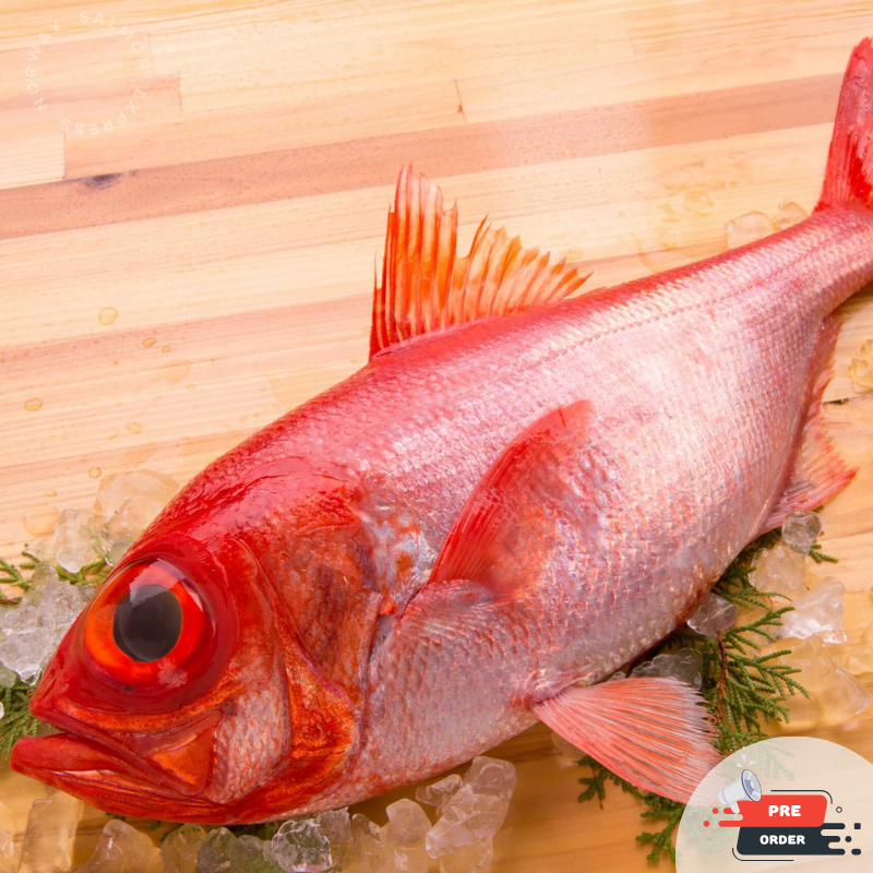 原條日本直送金目鯛, 金目鯛棲息在水深100~800m的深海中。日本以靜岡縣伊豆半島的東部相模灣產的最多最好,眼睛很大,體色是鮮豔的深紅色!!肉質細緻鮮美,適合作生魚片、壽司、紅燒、鹽燒等料理。